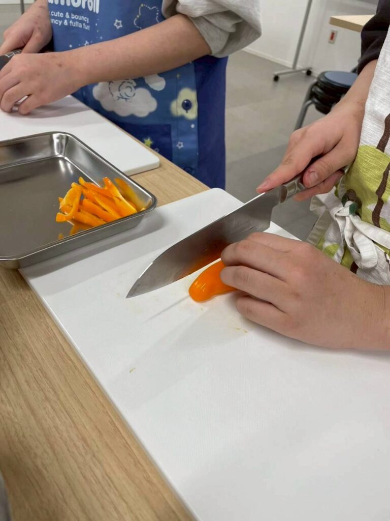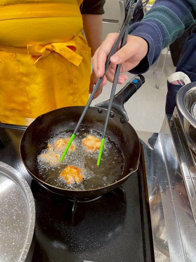 最初は少し緊張していた様子でしたが、色づきや音をよく観察しながら丁寧に揚げていて、とても上手にカリッと仕上がりました👏