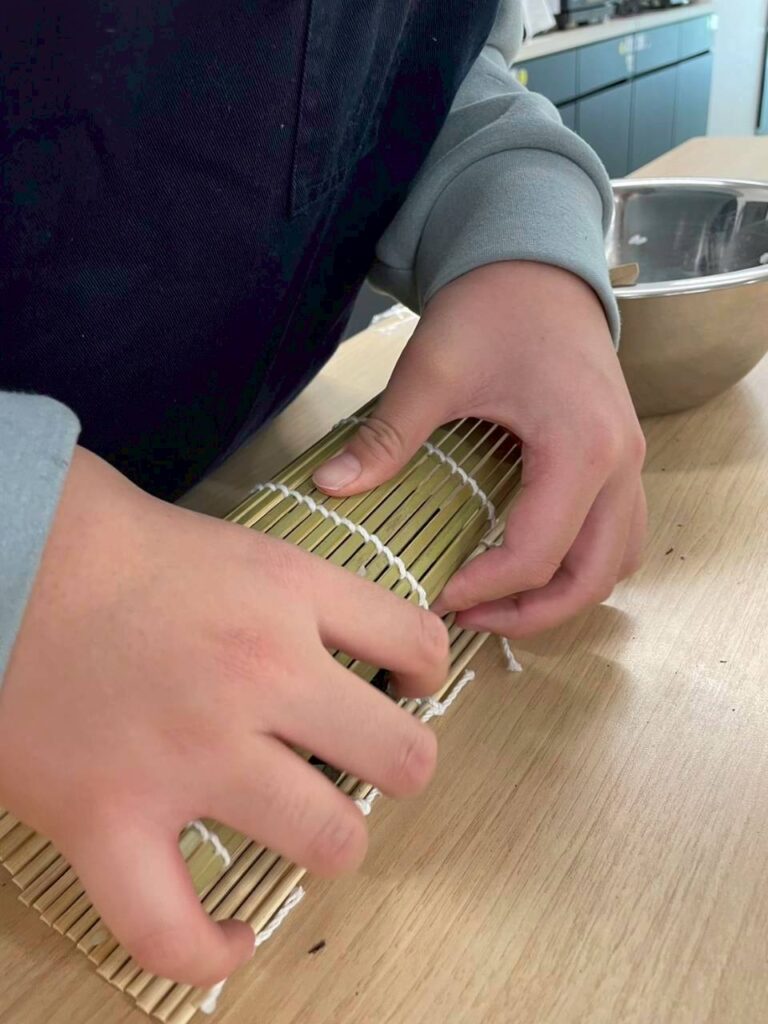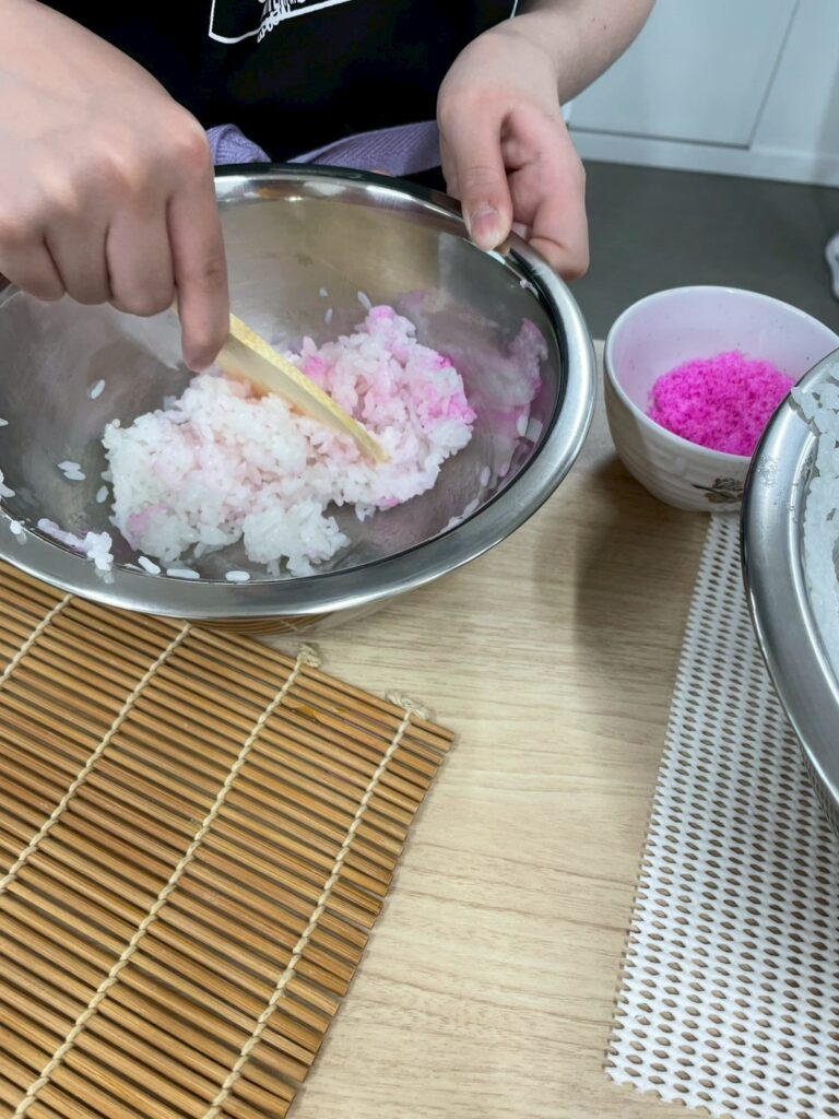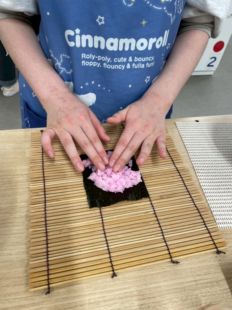 最初は少し緊張した様子でしたが、一つひとつ丁寧に取り組み、最後には見事な花模様の巻き寿司が完成しました。